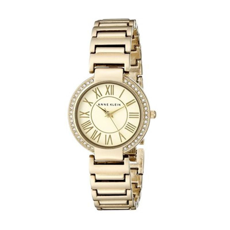This Anne Klein watch features a matte yellow gold plated link-style band, pale yellow face with roman numerals and crystal accents. Links can be removed to adjust size.