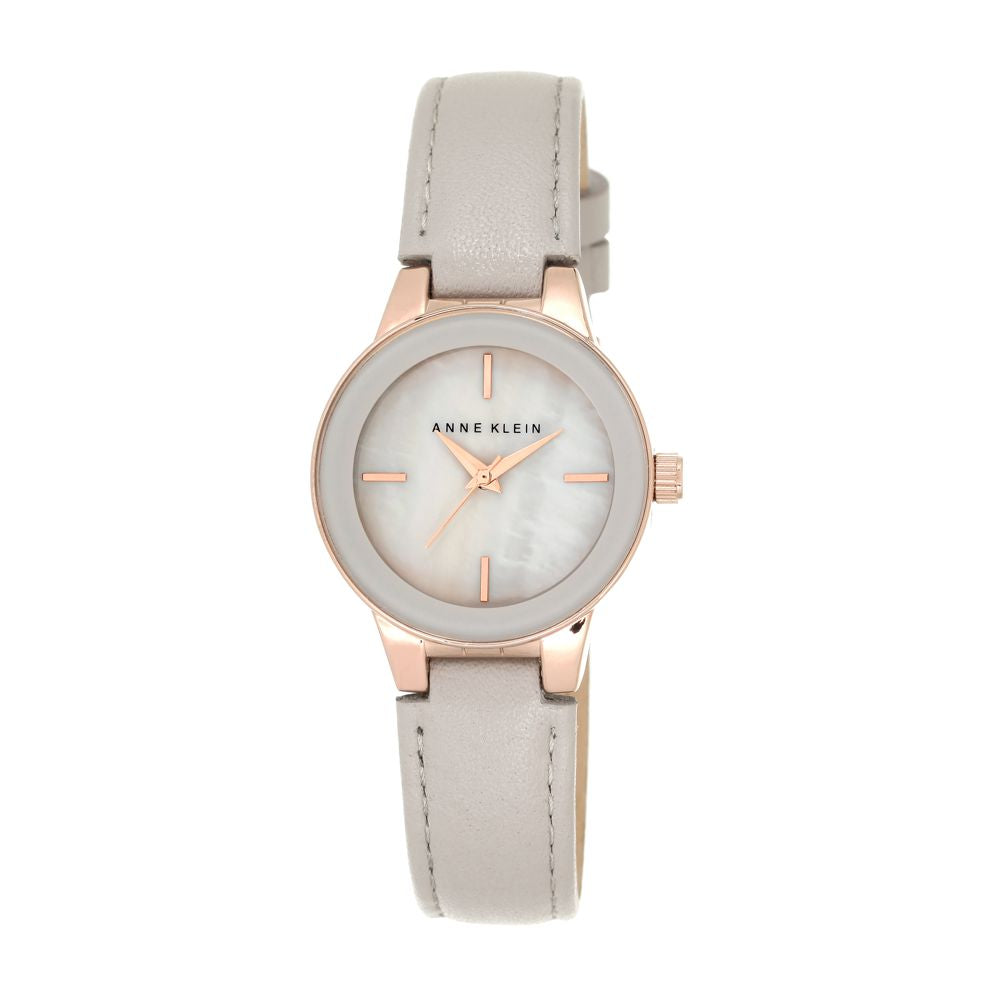 This Anne Klein watch features a light taupe leather band with rose gold plated case and accents. The dial is a beige mother of pearl.