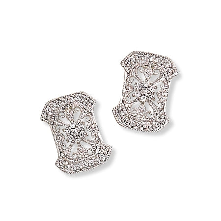 These earrings have claw-set Cubic Zirconias and an open-work, filigree design reminiscent of the jewellery made during the early 1900s (Edwardian period). Rhodium-plating prevents the silver from tarnishing.